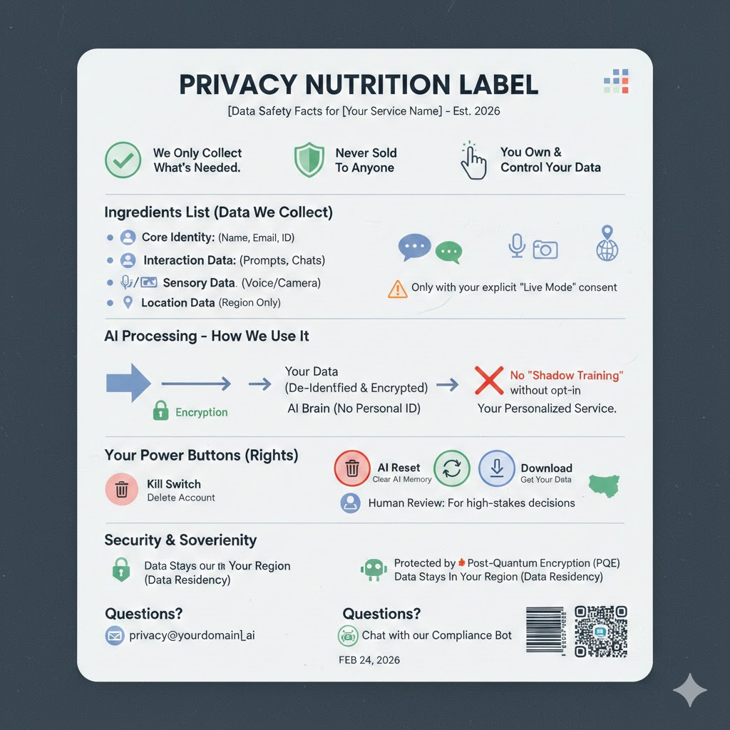 Professional-Tip for 2026: To be truly compliant, this notice should be paired with a "Nutrition Label"—a visual graphic that summarizes data safety, similar to those found on food packaging or the Apple App Store.